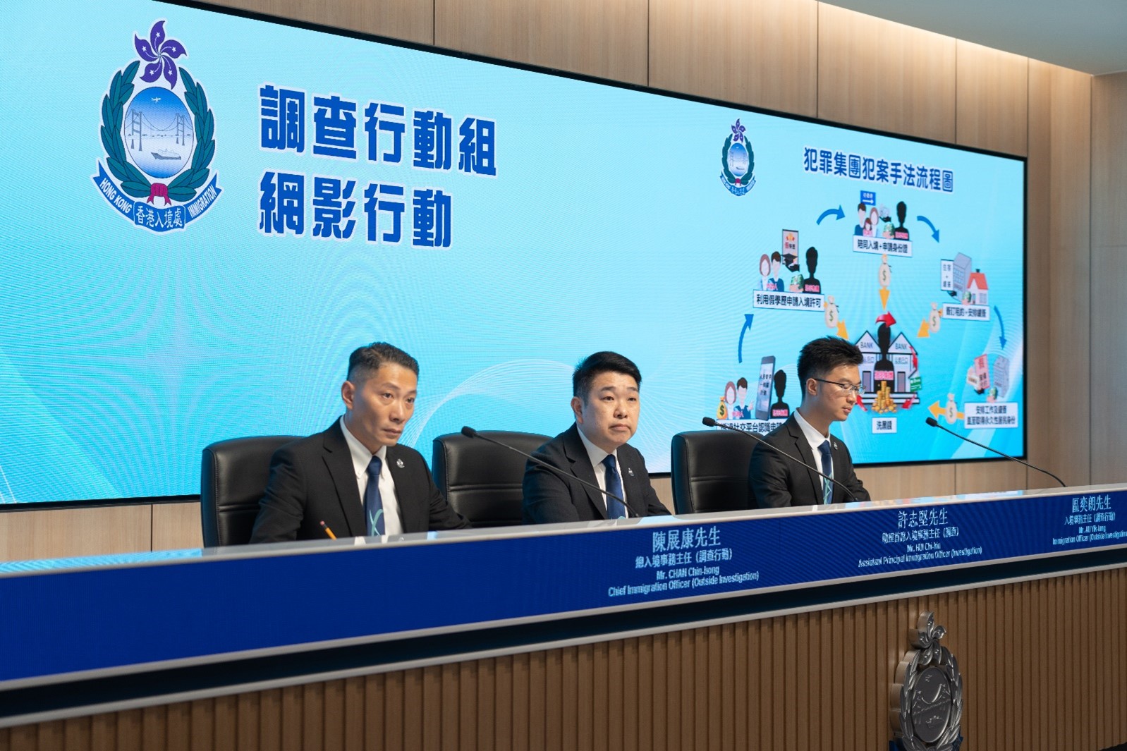 入境處瓦解一個利用虛假文書騙取高端人才通行證計劃入境許可的跨境犯罪集團。圖示助理首席入境事務主任(調查)許志堅(中)及調查人員今日(七月二十三日)在新聞發佈會講述行動細節。
