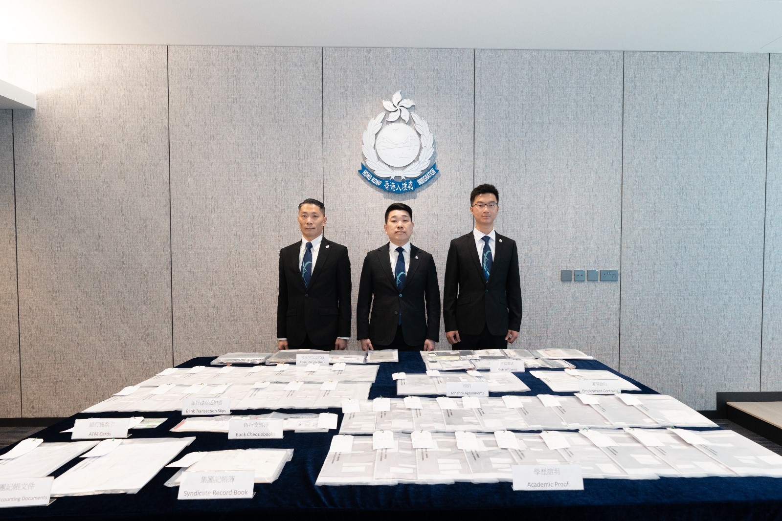 入境處瓦解一個利用虛假文書騙取高端人才通行證計劃入境許可的跨境犯罪集團。圖示助理首席入境事務主任(調查)許志堅(中)及調查人員今日(七月二十三日)在新聞發布會展示行動中部分檢獲的證物。