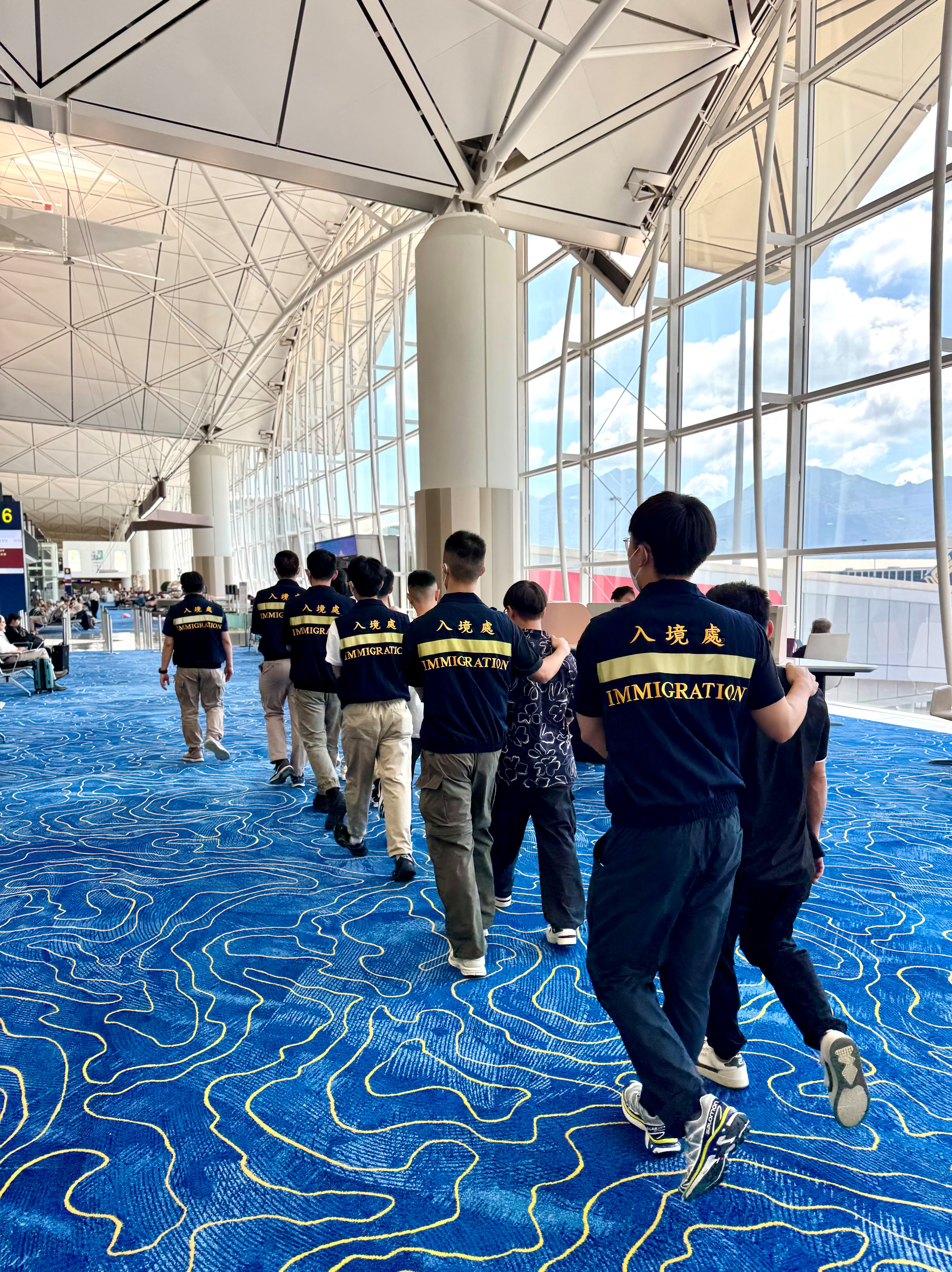 入境事務處(入境處)今日(九月二十六日)執行遣送行動,將31名越南籍非法入境者遣返越南。圖示被遣返人士在入境處人員押送下離港。