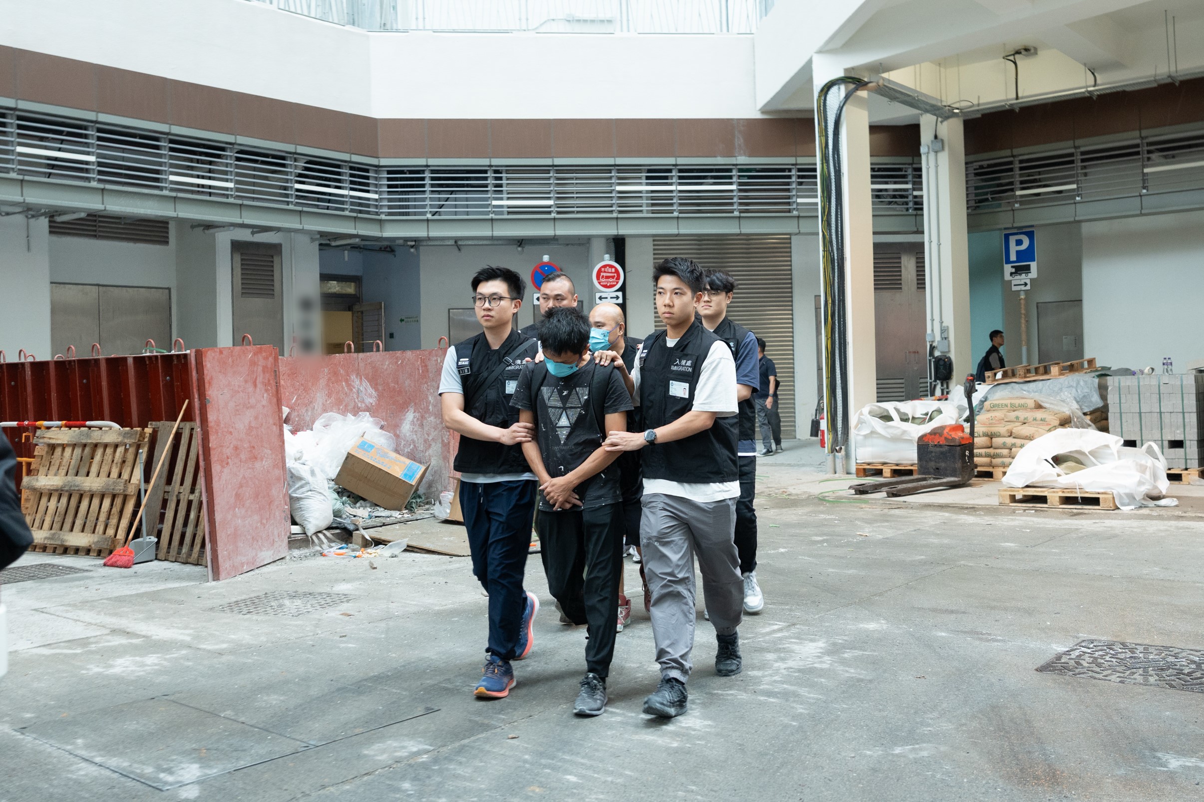 入境事務處於十月二十日至今日(十月二十一日)一連兩日在東涌區展開代號為「促進行動」的反非法勞工行動,以打擊從事裝修工作的非法勞工。圖示懷疑非法勞工在行動中被捕。