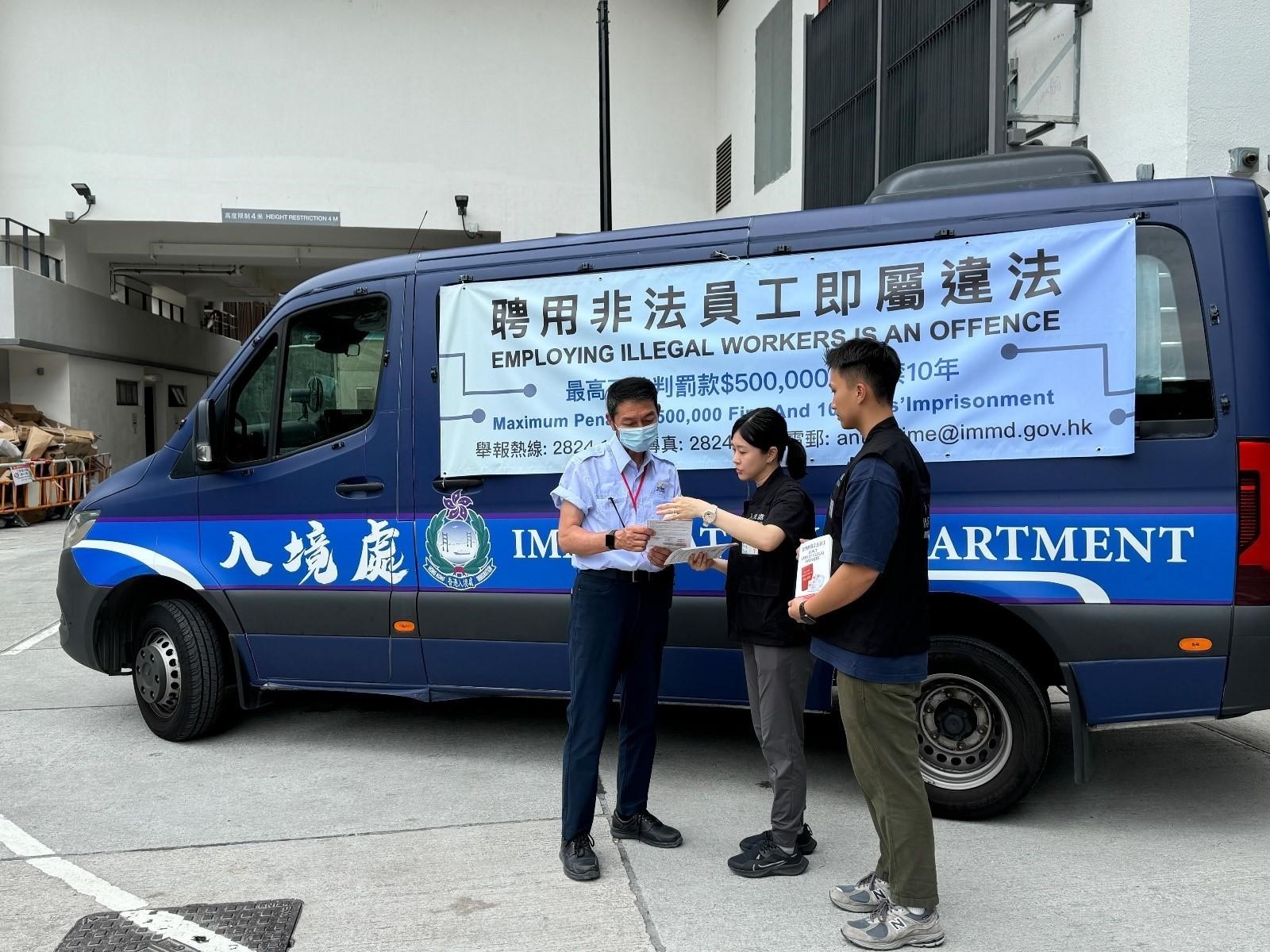 同時,入境處職員亦安排宣傳車及派員於屋苑內向住戶及物業管理人員派發「切勿聘用非法員工」的宣傳單張,呼籲切勿聘用非法勞工。