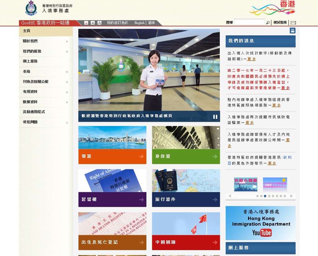本處的網頁(www.immd.gov.hk)設有繁體中文版、簡體中文版和英文版,除提供本處各項服務的最新資料外,還備有常用的申請表格,方便互聯網用戶下載使用。網頁於二零一五年三月十日革新,設計以客為本,既提供連接電子服務的方便途徑,也讓市民更容易瀏覽本處各項服務的資訊。網頁亦繼續採用無障礙網頁設計,方便所有市民,包括殘疾人士、長者、受色盲困擾的人士,以及認知和身體有問題如有讀寫困難的人士等,在瀏覽部門的資訊和服務時更便捷。