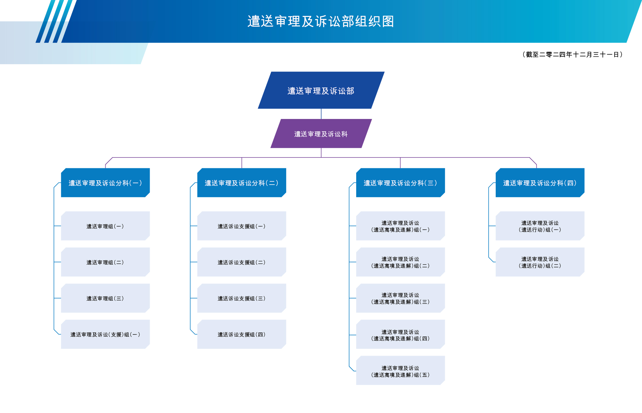 遣送审理及诉讼部于二零一六年六月成立,由一位助理处长管辖,其下的遣送审理及诉讼科则由一位首席入境事务主任掌管。