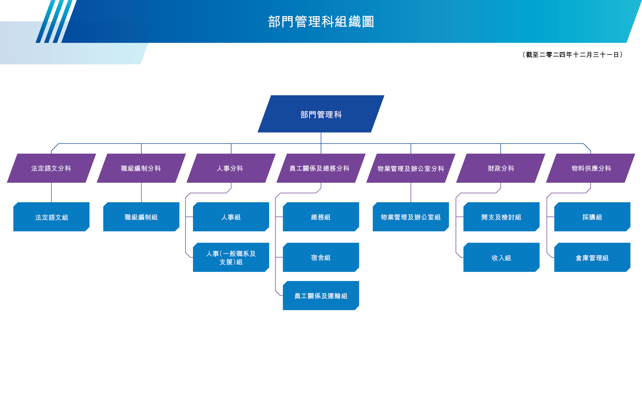 部門管理科由一位首席行政主任掌管,就部門的人事管理、編制管控、財務、物料供應及一般行政工作,直接向副處長負責。