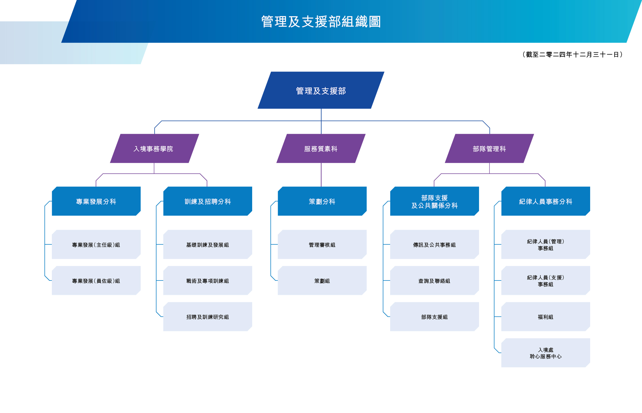 部隊管理科負責處理約7 000名入境事務隊成員的福利、行為、紀律,以及部門的公共關係事宜;服務質素科專責進行管理審核,就市民的投訴作出檢討,以及策劃新入境事務處總部的興建工作;學院則負責部隊成員的招聘、培訓、調配及專業發展事宜。