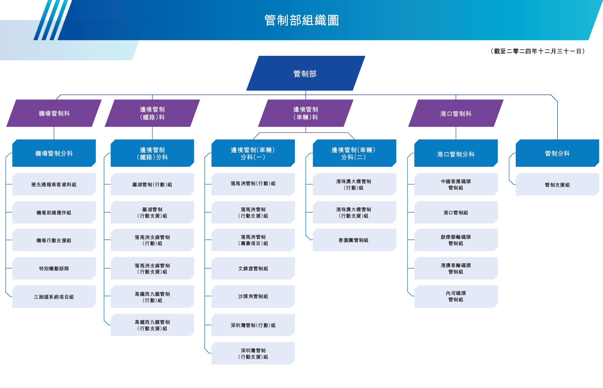 邊境管制(鐵路)科轄下設有四個管制站,分別位於羅湖、紅磡[備註]、落馬洲支線和廣深港高速鐵路西九龍站。羅湖和落馬洲支線管制站負責處理乘搭港鐵的旅客,而紅磡和高鐵西九龍管制站則分別為乘搭直通火車和高鐵往返內地的旅客提供出入境檢查服務。