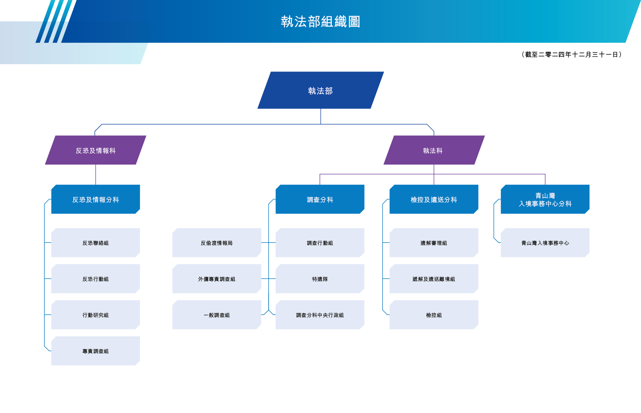 執法科負責制定和執行調查方面的政策、處理與入境事務有關的檢控、制定和推行有關遞解及遣送離境(免遣返聲請個案除外)的措施,以及管理用作羈留18歲或以上人士的青山灣入境事務中心。反恐及情報科負責制定本處的反恐策略和採取相關執法行動,以及與海外、內地和本港執法機關及駐港領事館聯繫以作情報交流。反恐及情報科人員亦代表本處參與跨部門反恐專責組的工作。